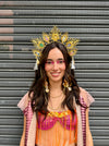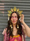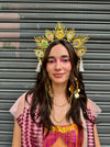 Arco produzido com folhagem em metal em formato de fogo com detalhes de pingentes holograficos em formato de gota. Detalhes em tasseis metalizados e guizo. Criado para elevar seu poder pessoal através do seu vestir.