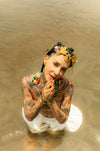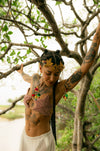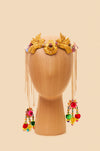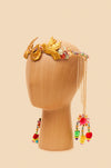 Headpiece produzida com patchs usados em vestimentas cerimonais festivas no Peru. São patchs com fios metalizados dourados. Headpiece com detalhe de pom pom colorido, correntes e bordado em pedrarias. Edição limitada de 3 peças.