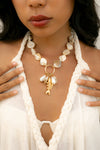 Choker produzida com madre pérolas e pérola de agua doce com pingente de peixe com banho, corrente reguladora para usar em diversos ajustes a sua escolha.