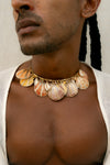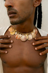 Colar tipo choker com conchas  e búzios naturais com detalhes banhados.