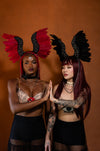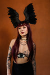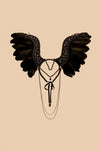 Arco produzido com base estruturada, bordados em pedraria e penas pretas.