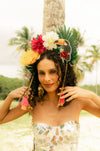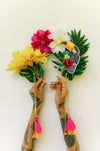 Arco com maxi flores em tecido, tucano em patch, folhagens e detalhes em tásseis. Criado para elevar seu poder pessoal através do seu vestir.